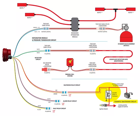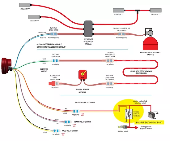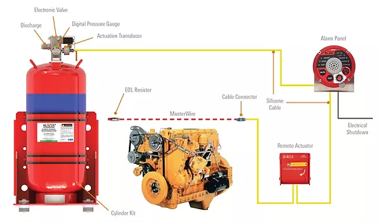 MusterWire is the detection method used in our electronic (LHD) fire suppression systems and is available in various temperature ratings to suit any application. MusterWire has a high-performance fluoro jacket giving it superior protection from abrasion, chemical permeation, weather and direct sunlight. The core of the wire consists of two strands of conductive wire that are separated by a heat sensitive polymer. When the wiring is exposed to the rated temperature, the polymer melts and the twin strands arc and send a signal to the Muster Alarm Panel which the actuates the fire Suppression System.